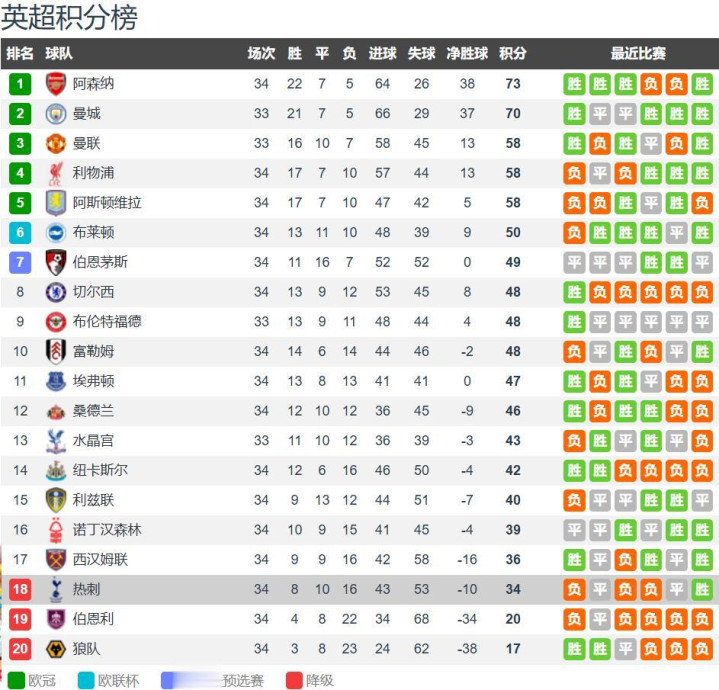 英超第34轮的比赛已经战罢9场,仅剩下曼城vs布伦特福德的比赛,随着利物浦3-1击败水晶宫,英超争五再无悬念;保级二选一,西汉姆联和热刺各自击败对手全取3分,其中热刺终结英超15轮不胜,算是保留保级希望;而阿森纳艰难击败纽卡斯尔终结两连败重返榜首。