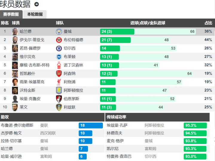 英超金靴和助攻王的争夺悬念不大西子湖金沙厅,哈兰德24球领跑,比第二名伊戈尔-蒂亚戈多了3球,但伊戈尔-蒂亚戈的21球中含7个点球,哈兰德只要不受伤,英超金靴还是稳得很;英超助攻王更无悬念,曼联队长B费18助遥遥领先,鲍文和谢尔基都是10助,并列第二。
