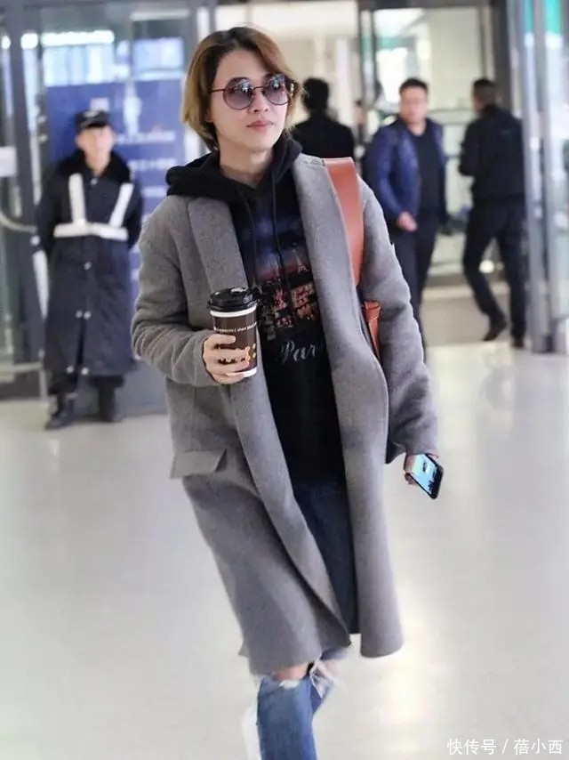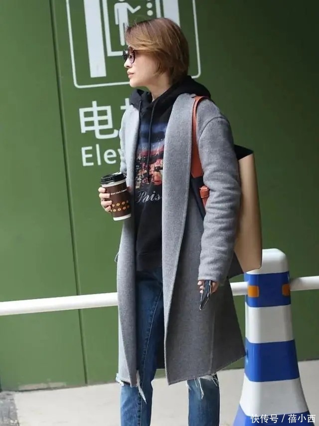灰色大衣的人气今年非常高涨,梅婷在里面搭配了一件黑色的卫衣,在显瘦的同时又能够衬托出满满的活力感,就像是大学生一样。一眼看过去既有灰色的高级又有黑色的稳重,而且卫衣作为内搭不像普通的黑色毛衣一样那么老气,这个创意还是很年轻化的。